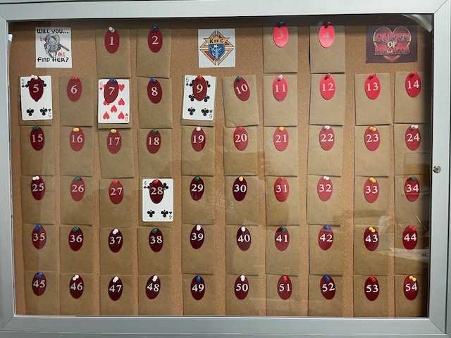 The lucky drawing winner was Mary Gay Priolette from Fairmont. Mary Gay chose Envelope number 5, which revealed the 5 of clubs. The winner was paid $ 100.00 for the selection. Jackpot carries over for next week’s drawing on Thursday, October 2, 2025. Tickets on sale at the Knights Hall Monday – Friday 10:00 am till 1:oo pm. Tickets are also available on Thursday nights, drawing from 5:00 pm to 6:45 pm. Live drawing features free drinks. Join us for the fun. The Estimated Jackpot for Thursday is $ 2,000.00
